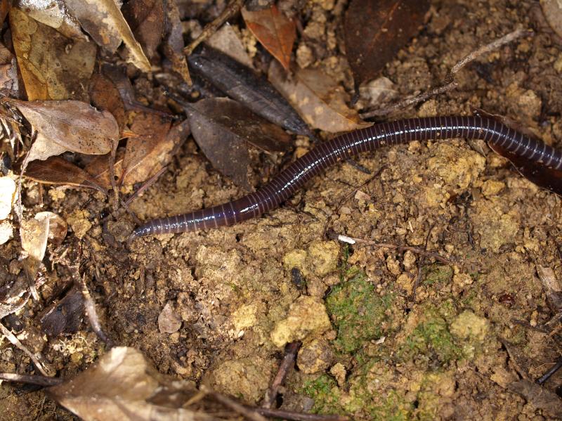 このミミズ、林床の落ち葉を拾い集めて、自分の巣穴に持ち込む習性を持つ。そして、巣穴はこのような落ち葉で満たされて、入口は大きな落ち葉のマウンドで隠される。このマウンドの中にはいろんな土壌動物がたくさん潜んでいて、森に棲む土壌動物が集積する島のような存在になっている。これがあっちこっちに点在しているため、この建造物は森の生態環境を保つかなり重要なポジションを担っているのだ。こんなおもしろいミミズ、世界的にも極めてめずらしいそうだ。