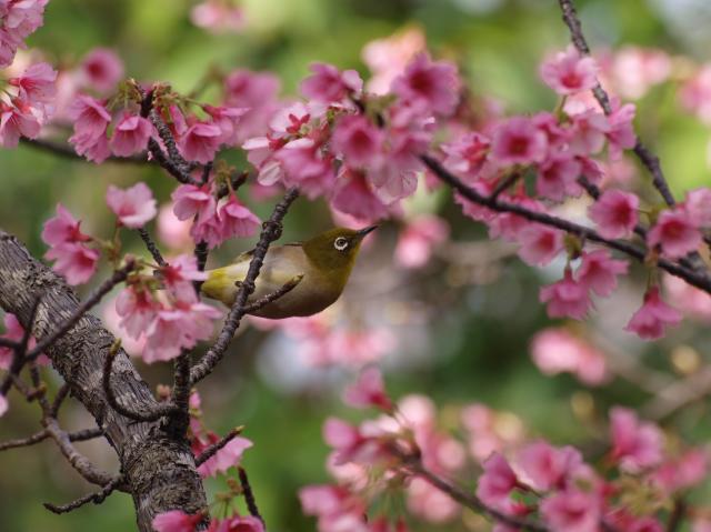 春香る蜜を求めて飛び舞う、リュウキュウメジロ