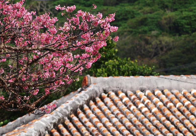 赤瓦の屋根をバックに映えるカンヒザクラです。