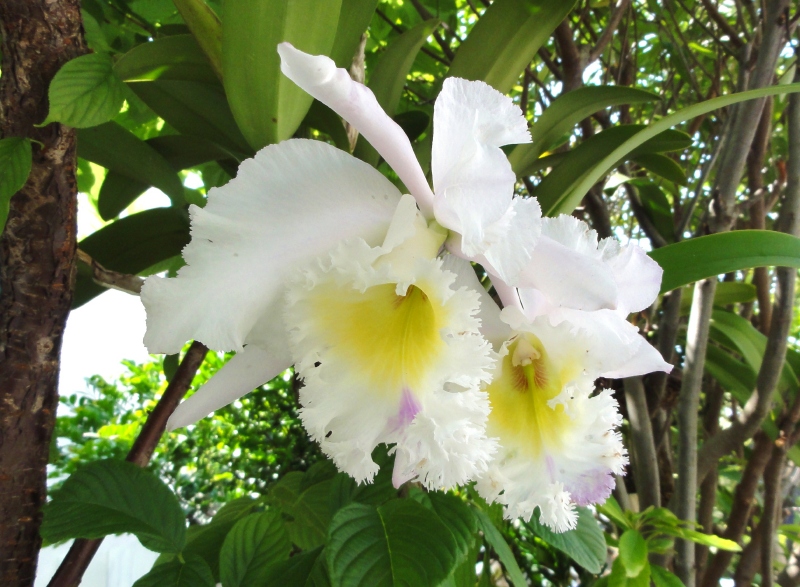 ランの一品種、気品に満ちた白いカトレア。ランは品種改良により何千品種とあるから、名前を知ることは難しい。庭の木に着生している。