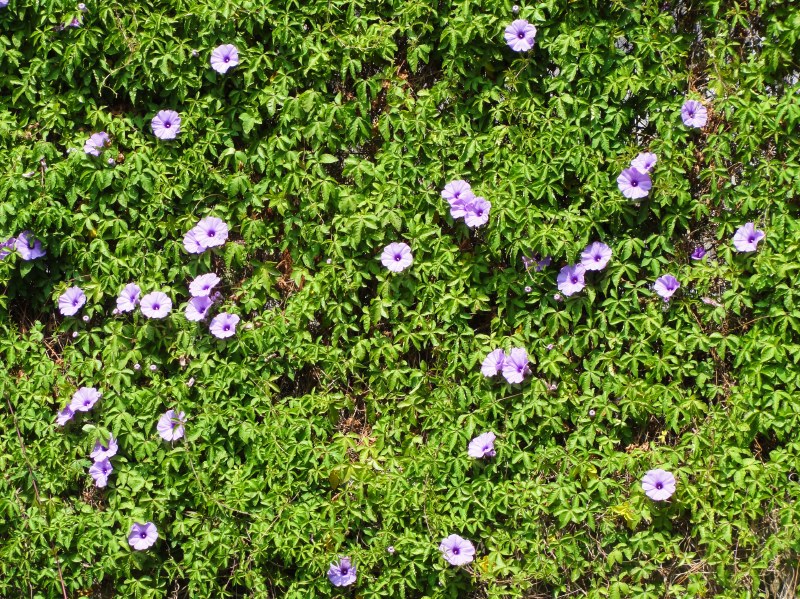 葉っぱが紅葉のような形をしている。ご近所の塀面を蔦状に這って花で埋め尽くしている。