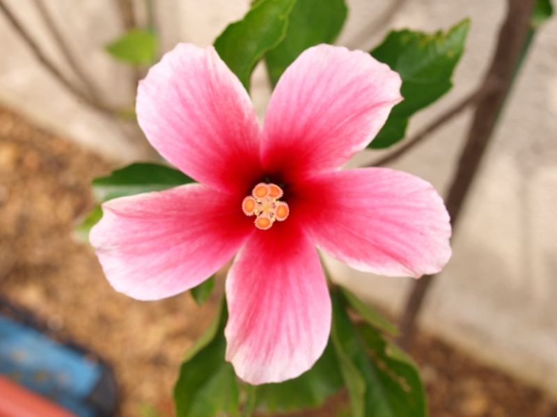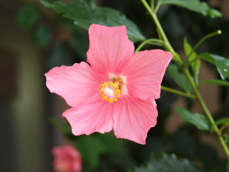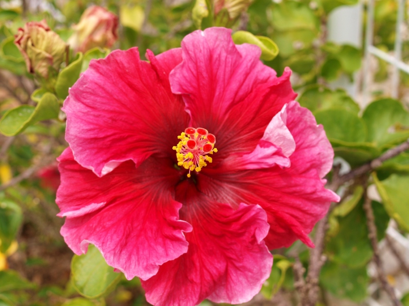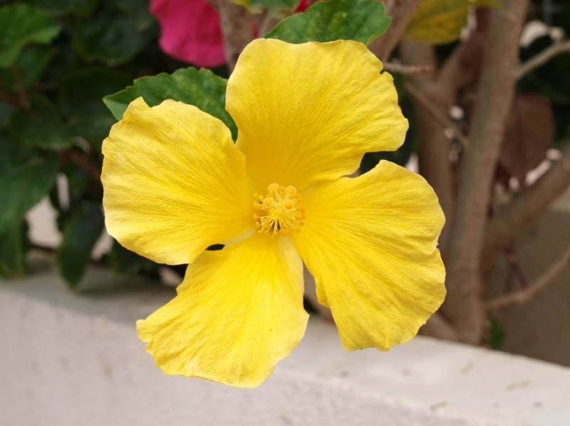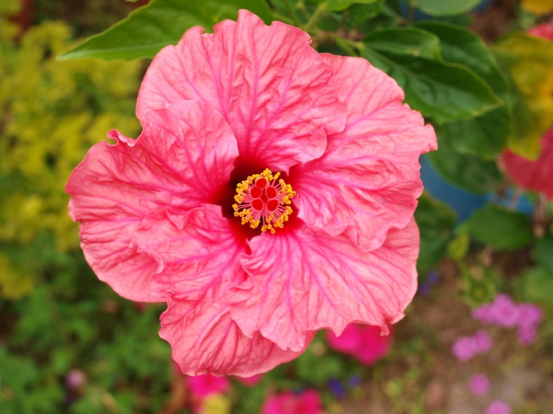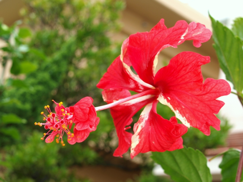 散歩をしてみると、名前は分らないけど、各家の庭の路地に面したところからいろんな種類のハイビスカスが顔を出していた。