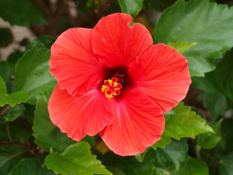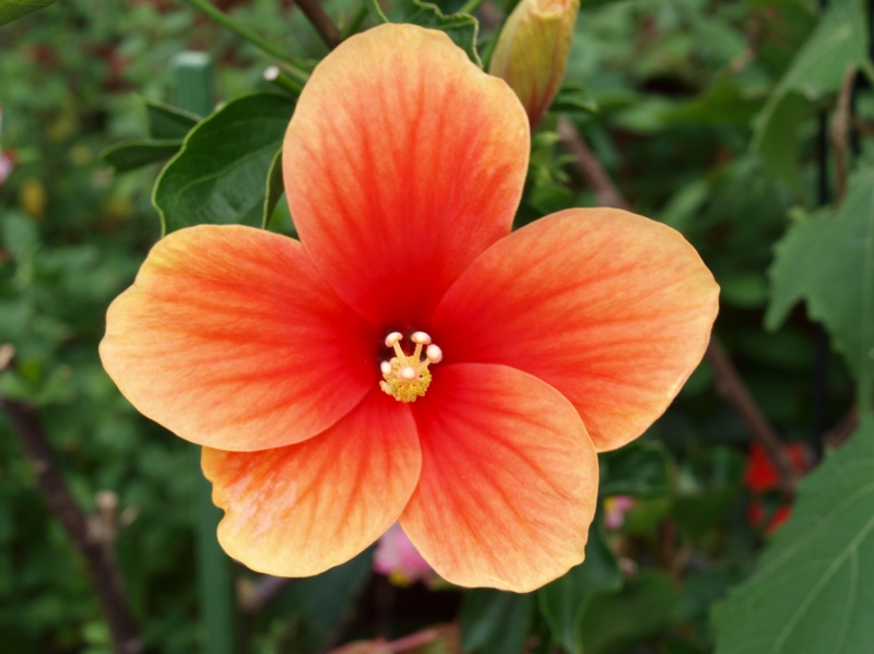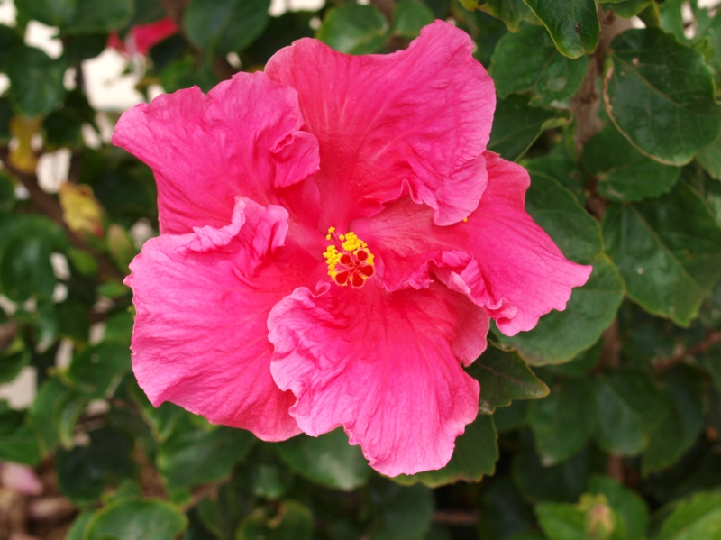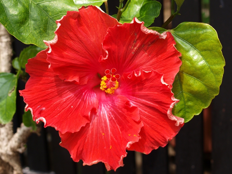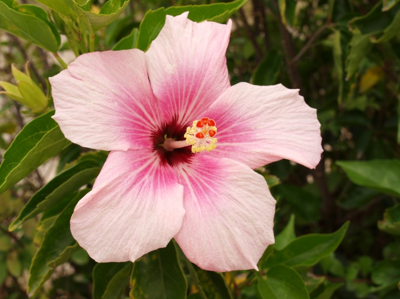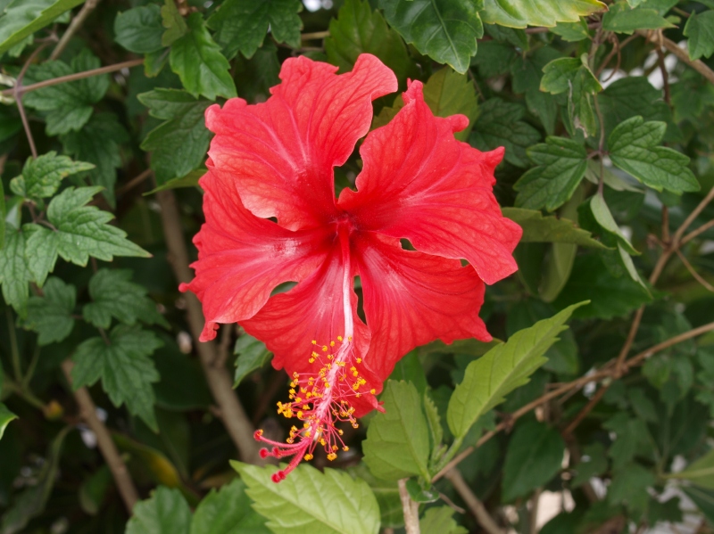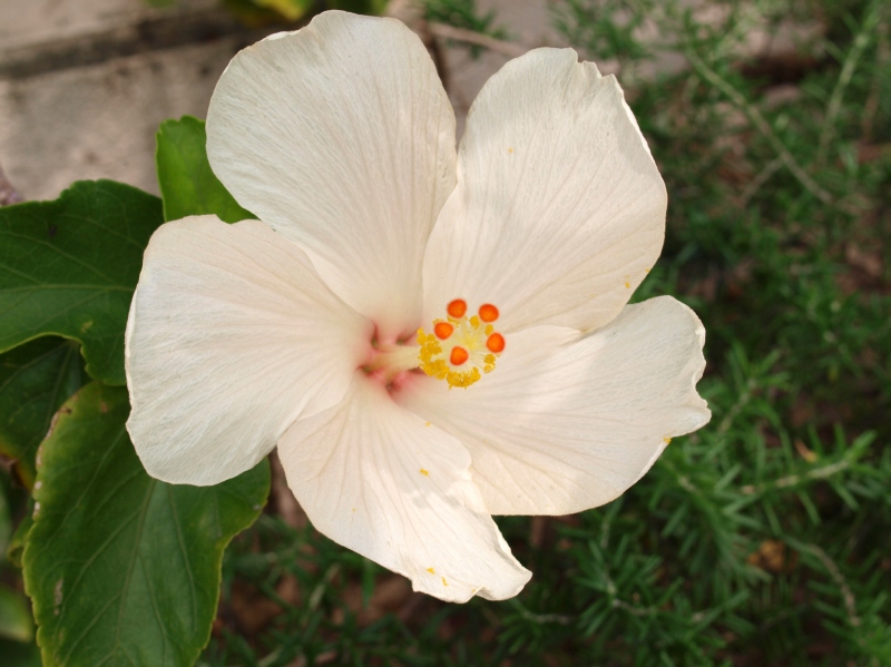 散歩をしてみると、名前は分らないけど、各家の庭の路地に面したところからいろんな種類のハイビスカスが顔を出していた。