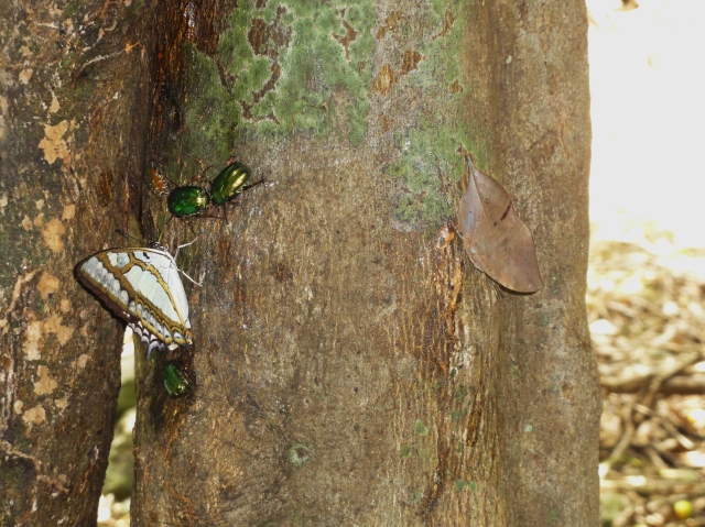 シークワサーの幹で仲良く樹液を吸っているフタオチョウとコノハチョウのツーショットです。