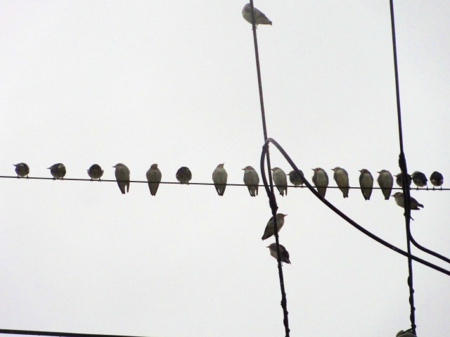 今度は、同じ日に、大宜味村で電線に止まっている50羽程のコムクドリの群れを見ました。