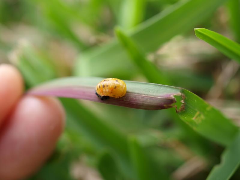 テントウムシの終齢幼虫は葉の裏などに体を固定して蛹になるが、ここの芝の葉は立っているので表裏がなく不向きである。そこで自ら折れ目をつけて葉を折り返し身を隠す場所を作ったのだろうか?そんな感じがする。