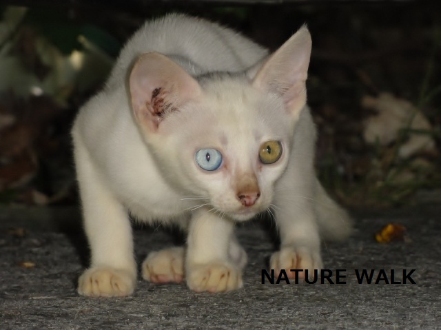 そこで、集落内を歩いていると珍しい子ネコに出会いました。右目がブルーで左目が黄金色の目を持つ白いネコです。
