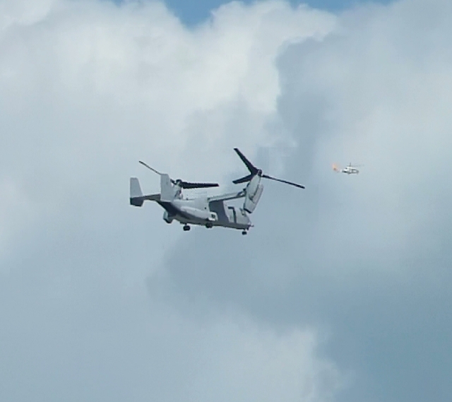 沖縄に到着したオスプレイ。右肩に見えるのは報道へり。