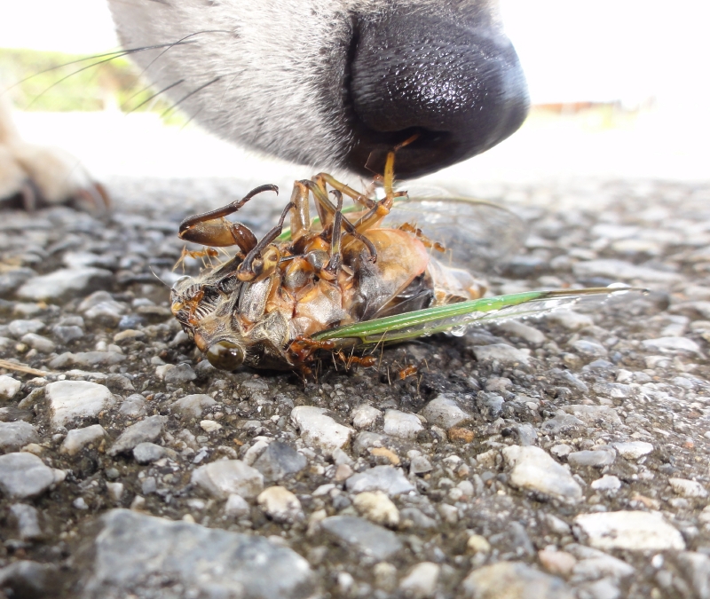 明け方、強い雨が突然に降りました。地面の下で何年も過ごし、初めて地上に顔を出し、木の枝に決死の思いで這い上がり、翅をやっとこさ伸ばし、自由に羽ばたくための筋肉や体を硬化しているところにその雨に叩き落されたのでしょう。