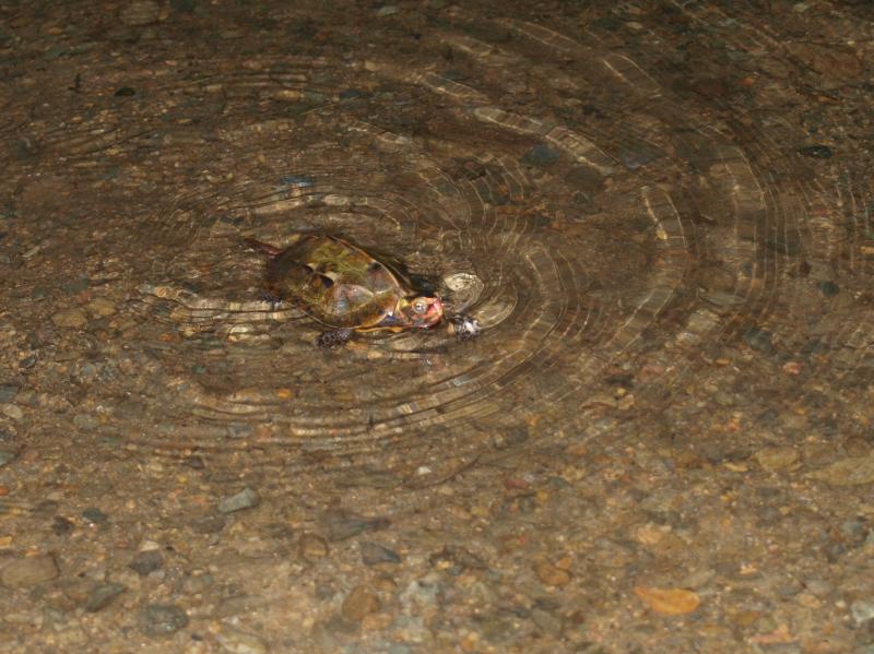 リュウキュウヤマガメが泳ぐのを初めて見た。陸生ガメなので水は大の苦手だろうと思っていたのだが、どうも平気のようだ。泳ぎ方から急流は無理としても穏やかなところなら全然大丈夫そう。考えてみると、確かに彼らの生活圏は水の流れだらけなのだ。生きていくためにはそれは決して避けることのできないものである。
