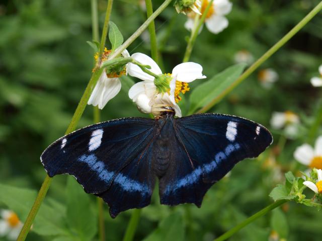 大宜味村喜如嘉の林道を歩いていると、その脇のアワユキセンダングサにルリタテハが止まっていた。見事に翅が展開していてキレイだ。