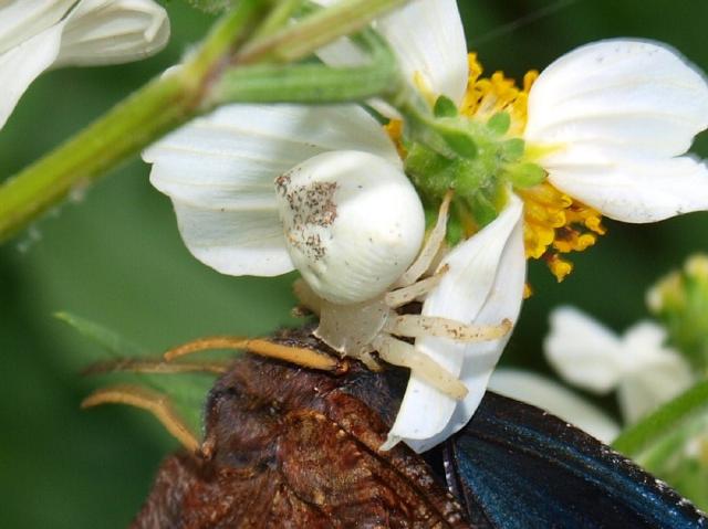 オキナワアズチグモはカムフラージュ戦術をするクモの代表格。体が白い花びらに溶け込んでいるあたりは流石だ。蝶だけでなく人の目もごまかしているね。こんな人狩りグモがいたらと想像するとゾッとするよ。